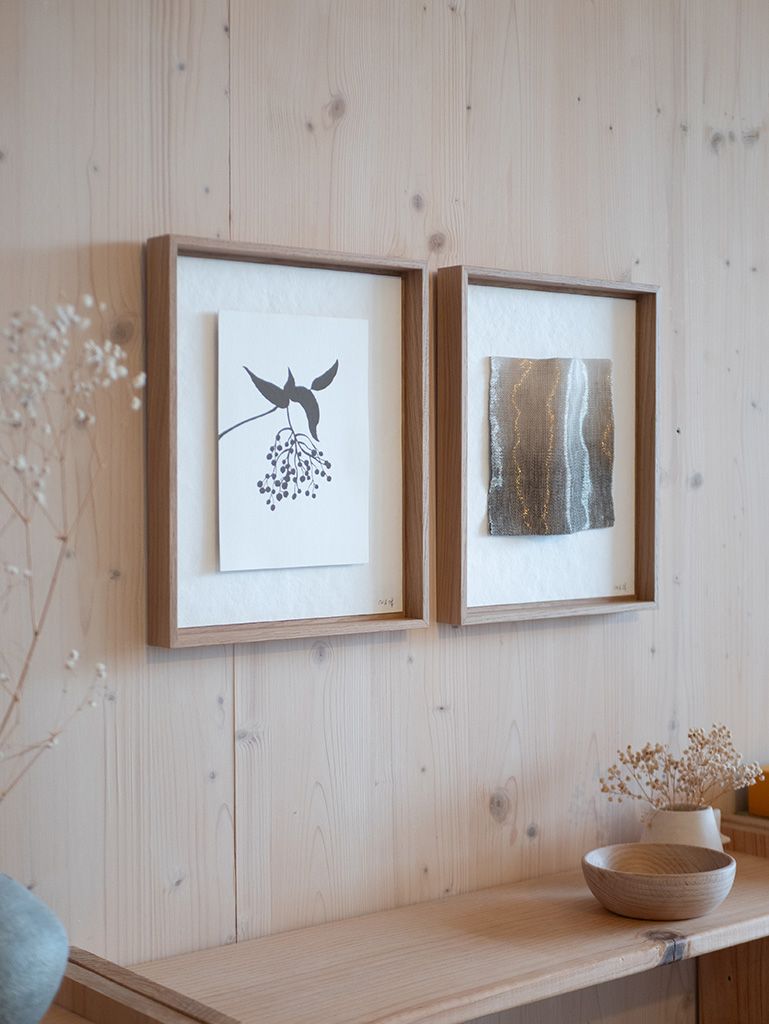 Le diptyque botanique est composé d’une illustration sérigraphiée et d’un tissage métallique, encadrés séparément.