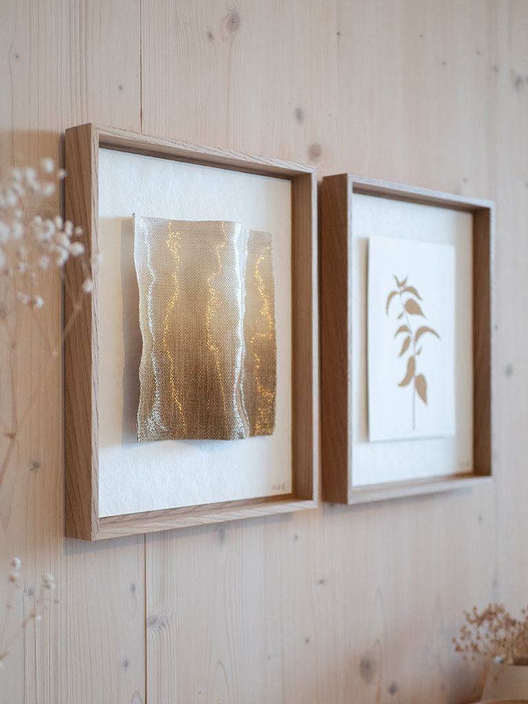 Le diptyque botanique est composé d’une illustration sérigraphiée et d’un tissage métallique, encadrés séparément.