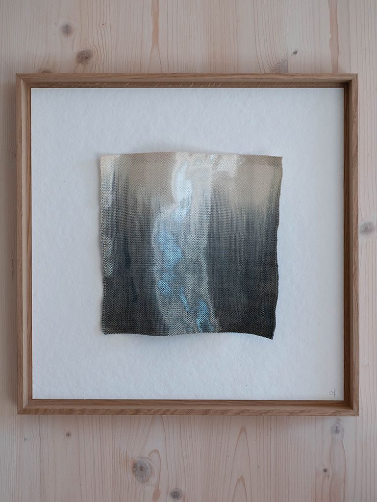 Le tissage est fixé à un fond en papier coton texturé, monté dans une caisse américaine en chêne. Bride de suspension au dos.